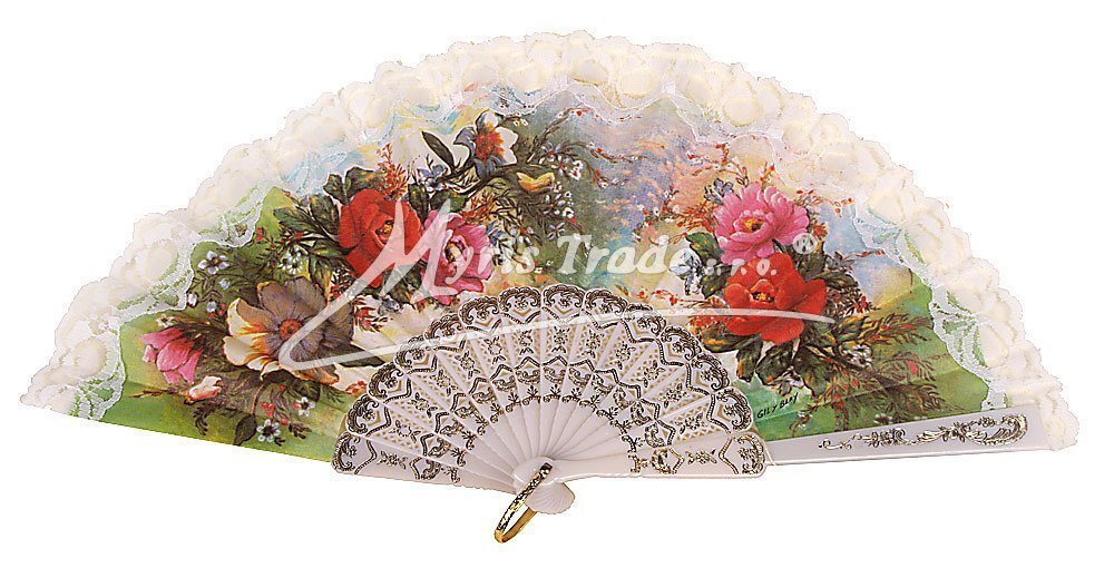 plastový vějíř s květinovým motivem a bílou krajkou lze použít nejen jako krásnou dekoraci, ale je i plně funkční