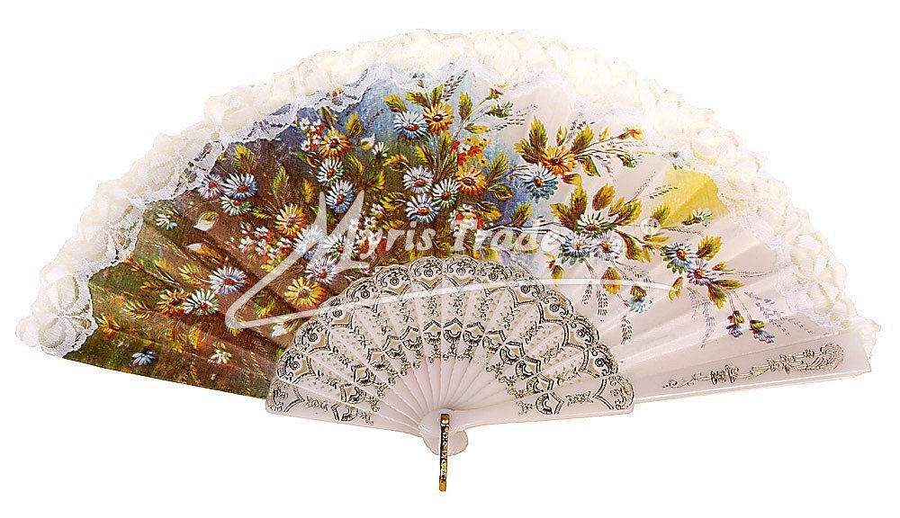 plastový vějíř s květinovým motivem a bílou krajkou lze použít nejen jako krásnou dekoraci, ale je i plně funkční