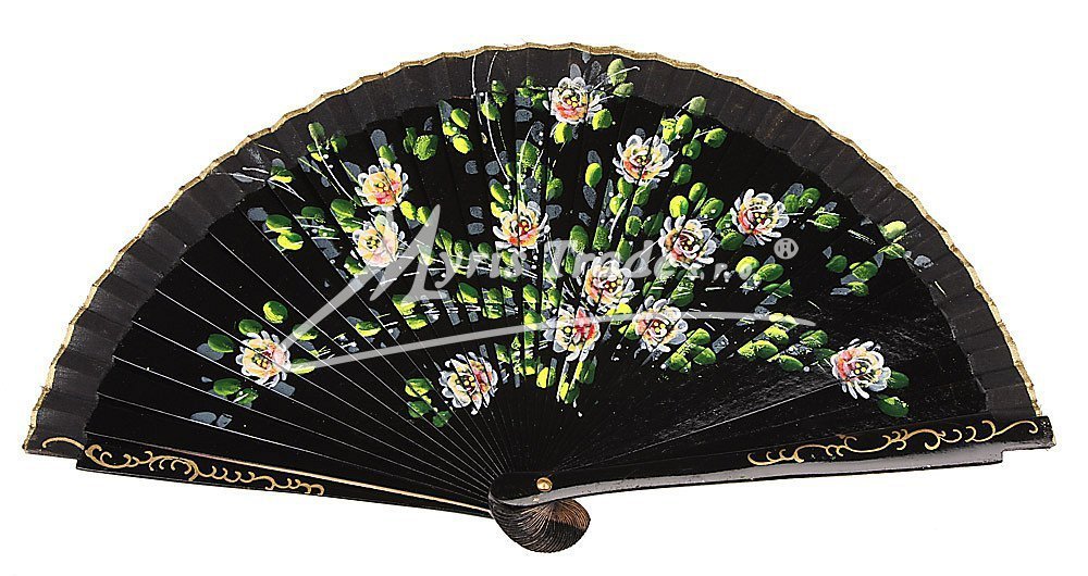 vějíř z lakovaného, hladkého dřeva a textilu, bohatě ručně malovaný stejným motivem na obou stranách