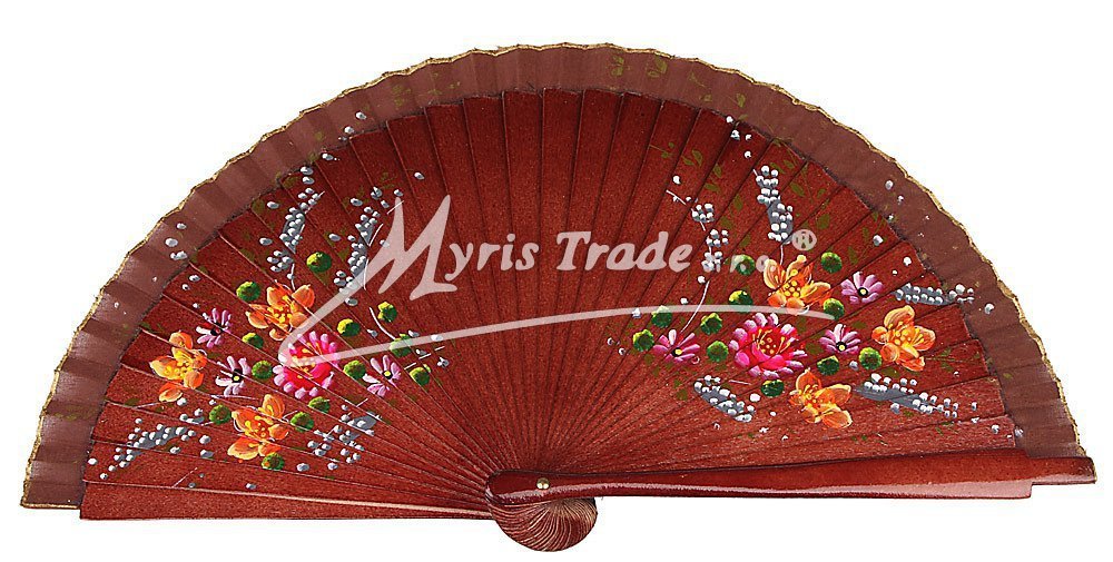 vějíř z lakovaného, hladkého dřeva a textilu, bohatě ručně malovaný stejným motivem na obou stranách