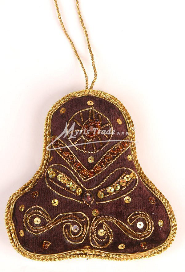 Ručně pošívaná textilní vánoční ozdoba. Tato typická vánoční ozdoba je vyrobena z textilu a je bohatě ručně pošitá drobnými korálky, flitry a kovovým drátkem ve zlaté barvě.