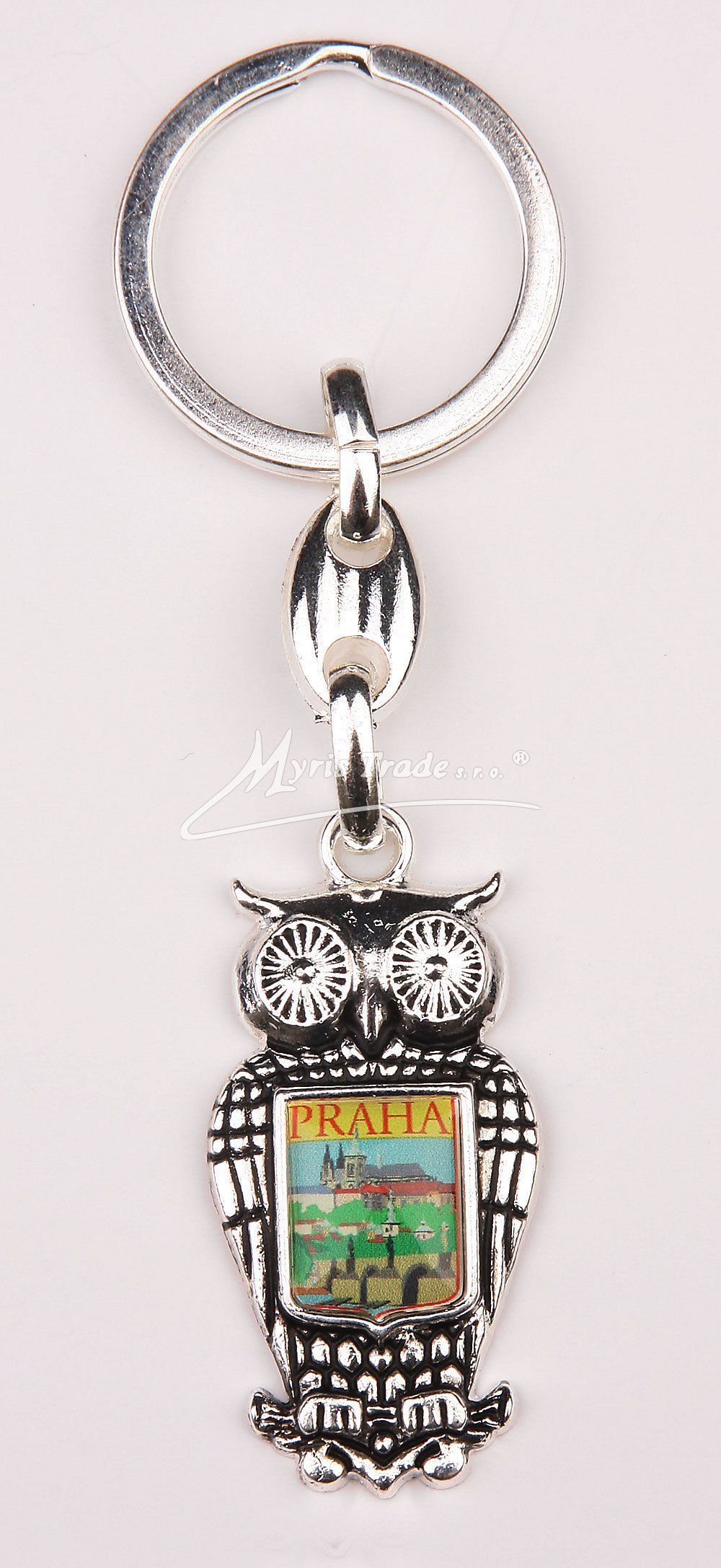postříbřená klíčenka v podobě sovy s motivem Prahy