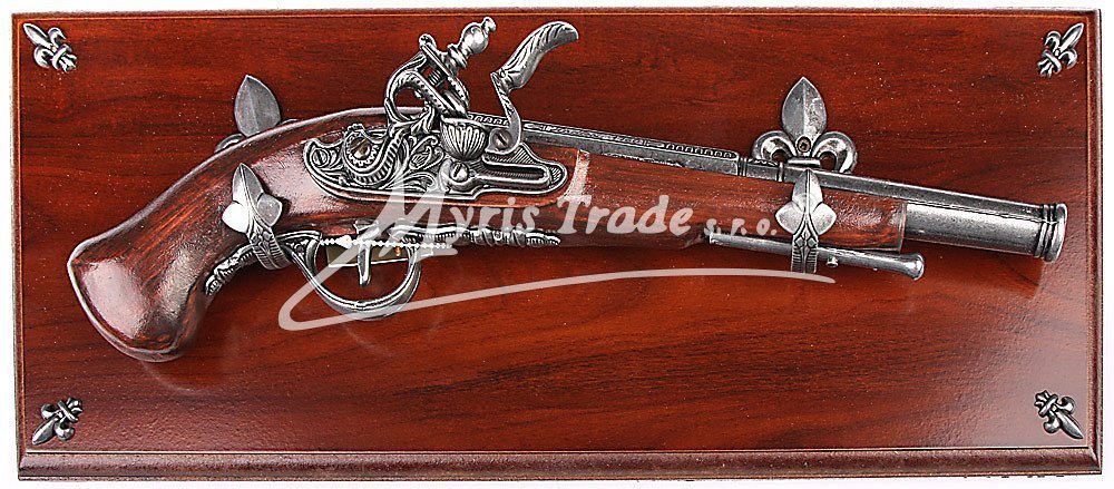 replika historické pistole z imitace dřeva na ozdobné desce s dekorativními háčky pro zavěšení pistole
