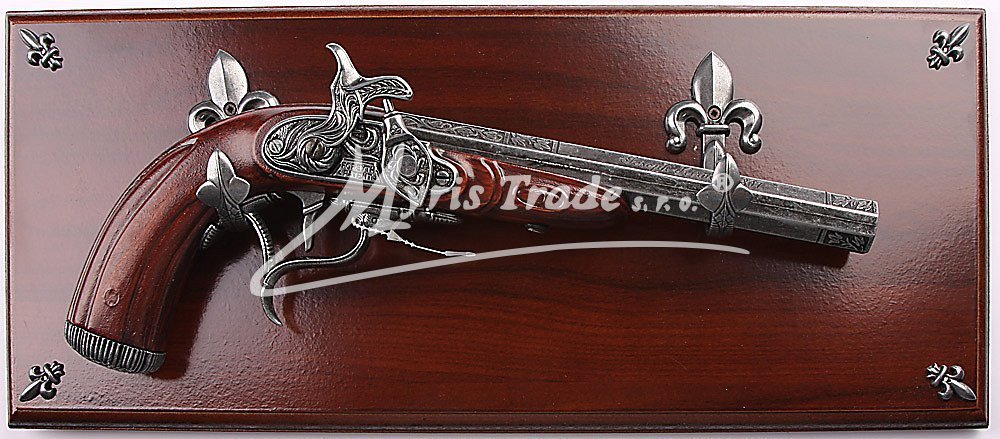 replika historické pistole z imitace dřeva na ozdobné desce s dekorativními háčky pro zavěšení pistole