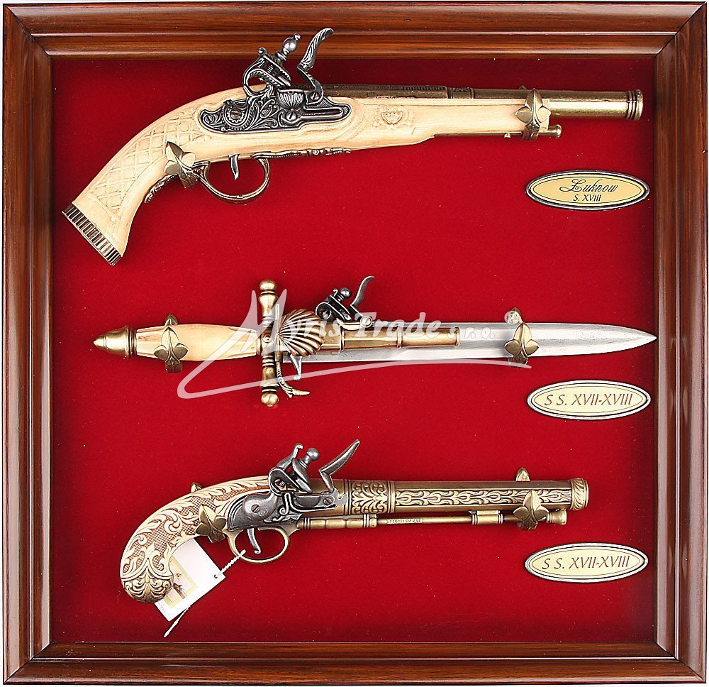 tři repliky historických pistolí z imitace slonové kosti v ozdobném rámu s červeným sametovým podkladem a s dekorativními háčky pro zavěšení pistolí