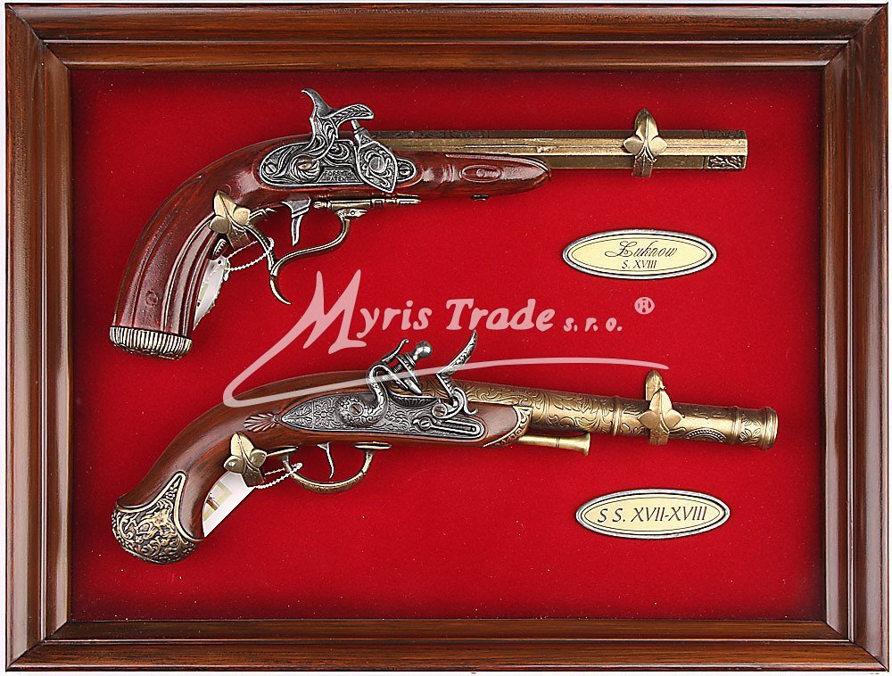 dvě repliky historických pistolí z imitace dřeva v ozdobném rámu s červeným sametovým podkladem a s dekorativními háčky pro zavěšení pistolí