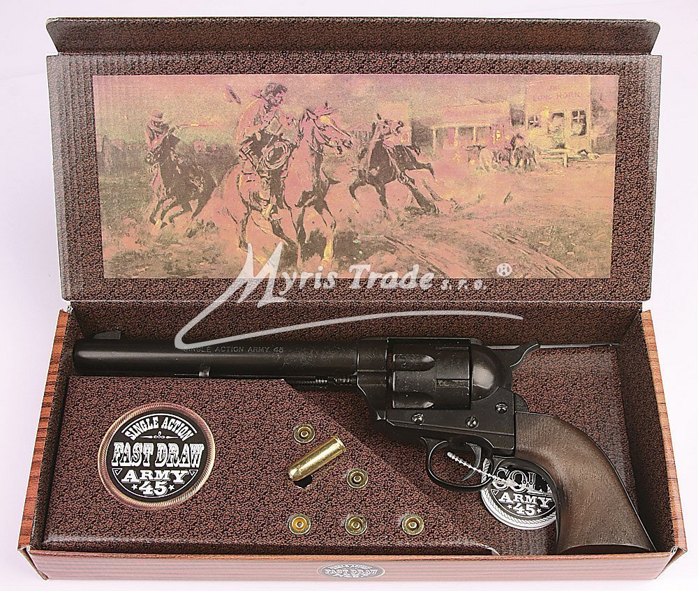 balení: stylově potištěná krabice s 6ti replikami nábojů váha repliky kopíruje váhu pravé zbraně, mechanizmus otáčení bubínku je funkční