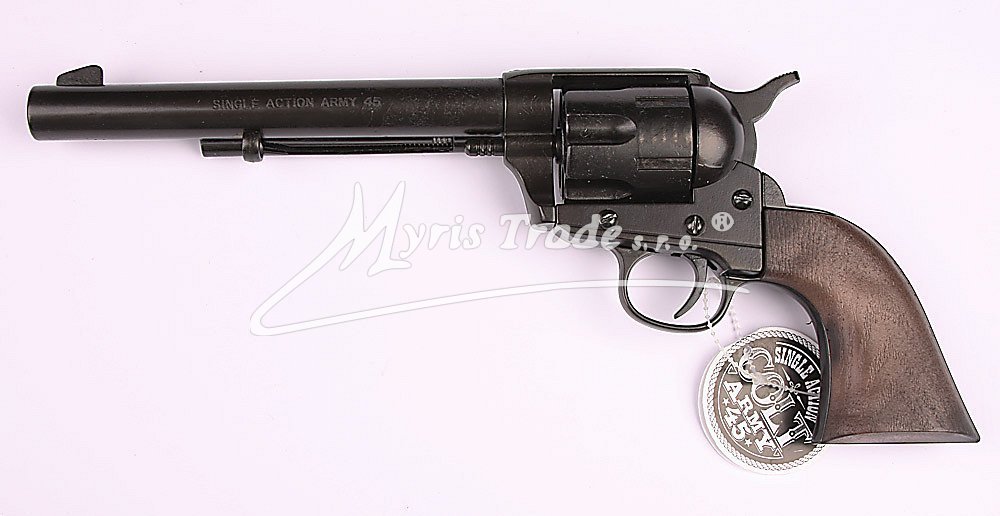 nefunkční replika koltu s pažbou z dokonalé imitace dřeva - kovové části v černé barvě prodloužená verze hlavně kopie armádního Smith & Wesson ráže 45 zvaný "Peacemaker"