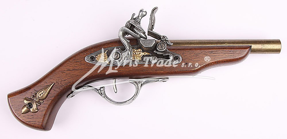 nefunkční replika historické křesadlové pistole ze dřeva a bronzového kovu