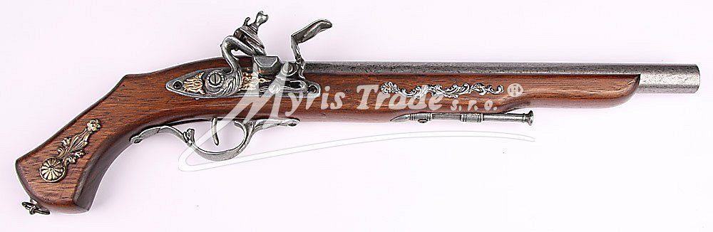 nefunkční replika historické křesadlové pistole ze dřeva a šedého kovu
