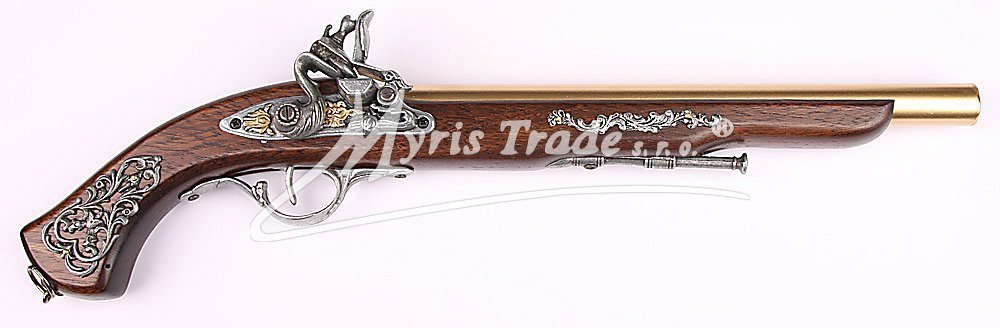 nefunkční replika historické křesadlové pistole ze dřeva a bronzového kovu