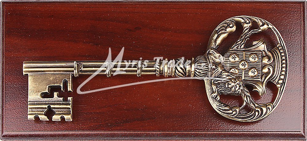 kopie historického ozdobného klíče v bronzové barvě na dřevěné leštěné desce slouží jako dekorativní věšák na klíče