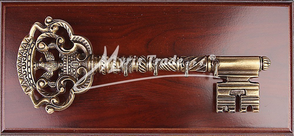 kopie historického ozdobného klíče v bronzové barvě na dřevěné leštěné desce slouží jako dekorativní věšák na klíče