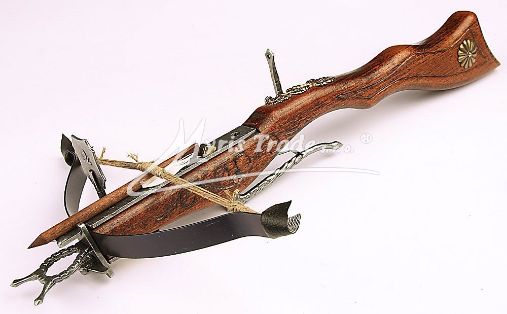 malá nefunkční replika historické kuše s dolním spouštěcím mechanizmem vyrobená ze dřeva a šedého kovu s dřevěnou šipkou