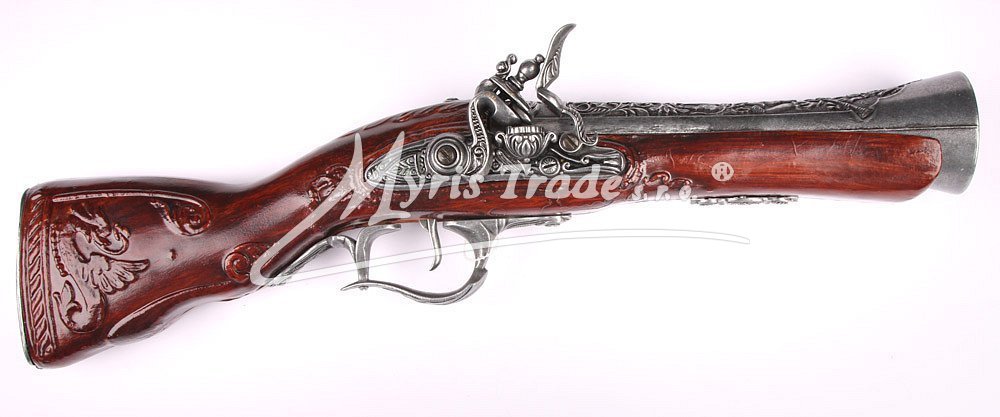 luxusně provedená nefunkční replika historické křesadlové pistole - trombónu z dokonalé imitace dřeva a šedého kovu