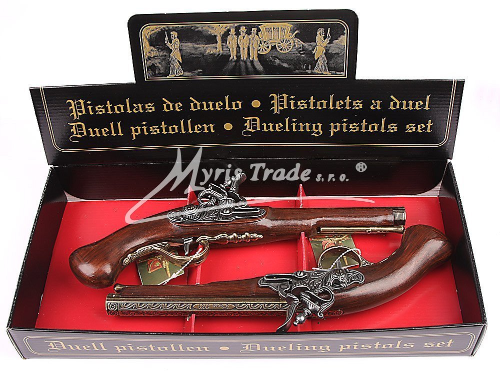 luxusně provedená soubojová sada nefunkčních replik historických pistolí z dokonalé imitace dřeva a bronzového kovu ve stylovém balení