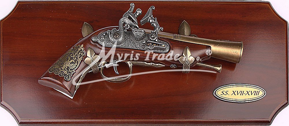 replika historické pistole z imitace dřeva na ozdobné desce s dekorativními háčky pro zavěšení pistole