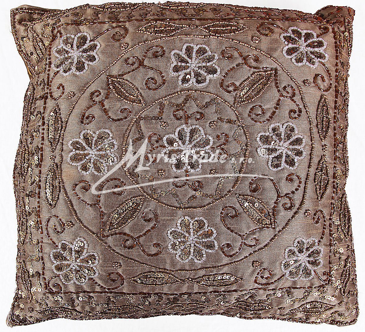 dekorační, ručně vyšívaný, bohatě zdobený potah na polštářek v bronzové barvě