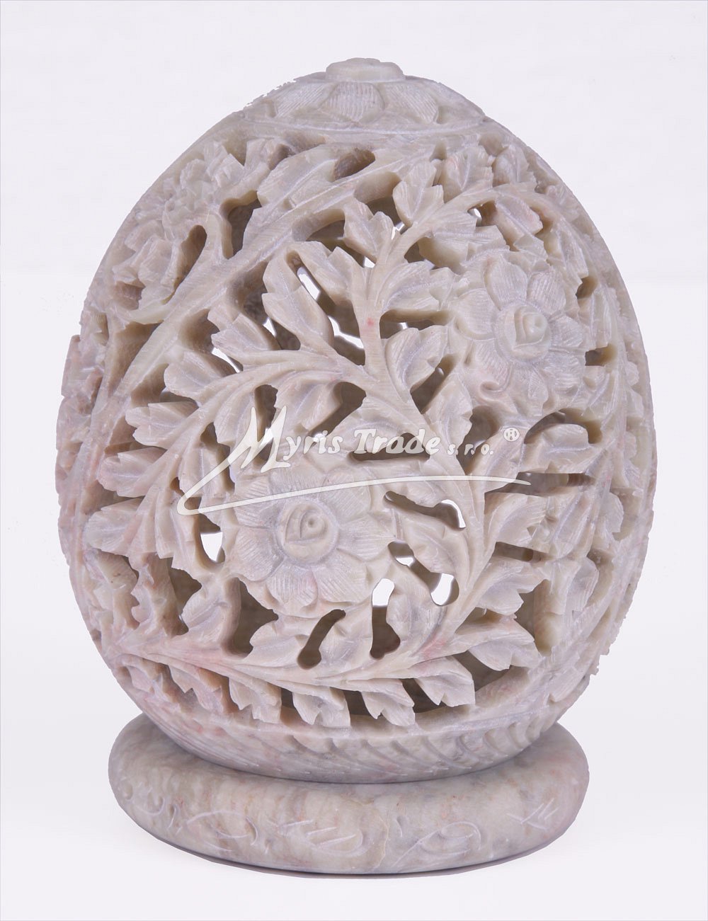 bohatě vyřezávaný svícen na čajovou svíčku vejčitého tvaru je ručně vyroben z mastku, jednoho z nejměkčích kamenů