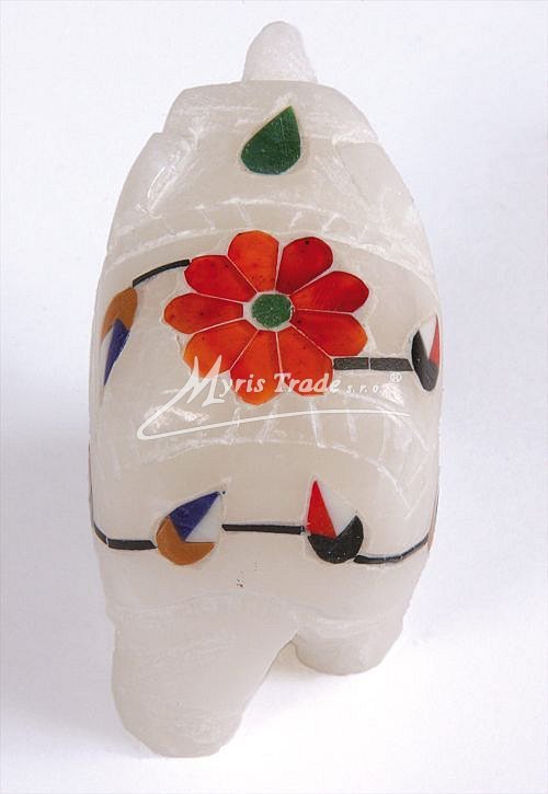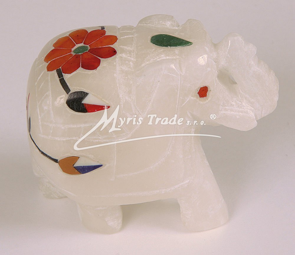 figurka slona vyřezaná z bílého mramoru vykládaná různými druhy polodrahokamů.