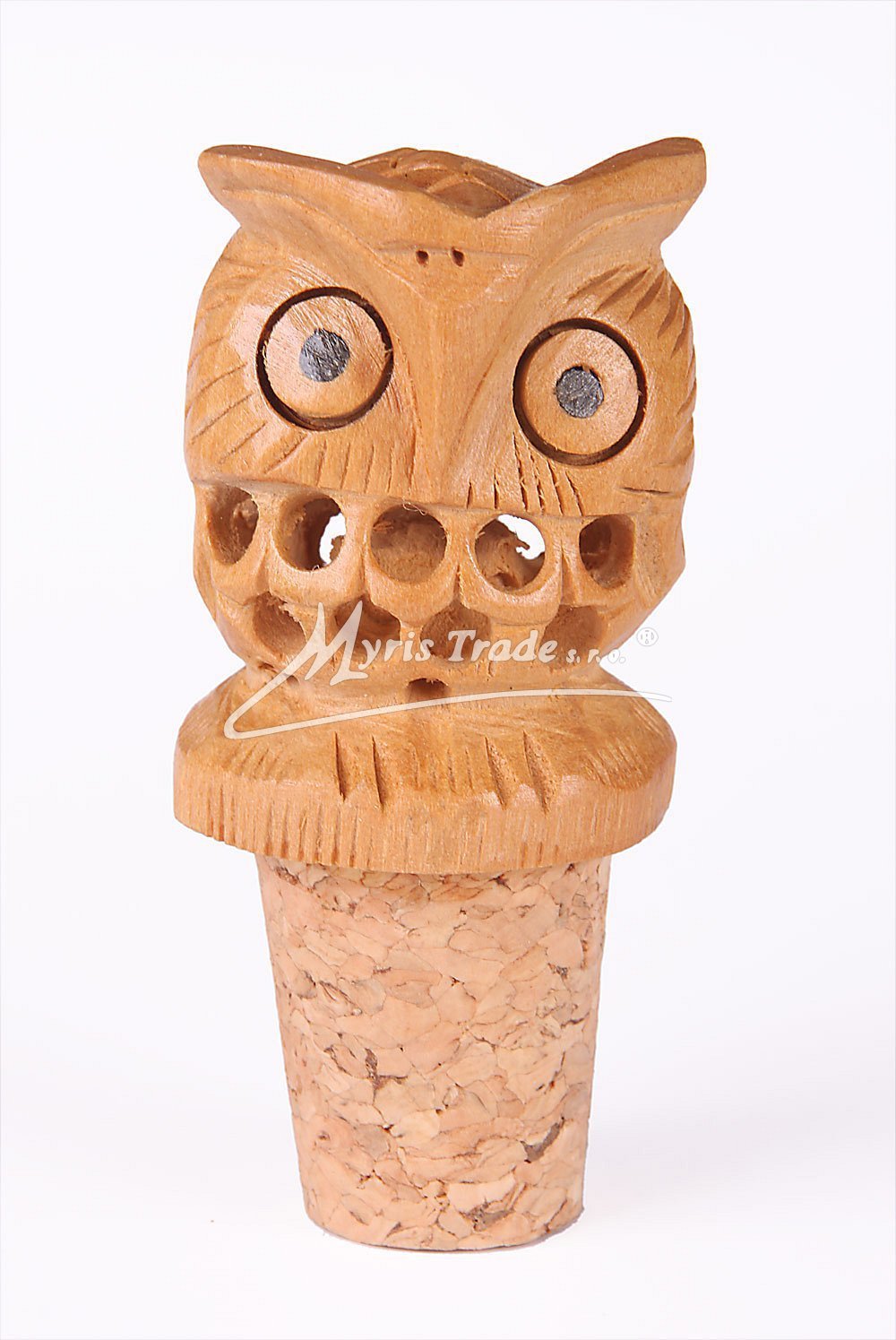 dřevěná ozdobná zátka s korkovým špuntem a figurkou sovy - vyřezávaná