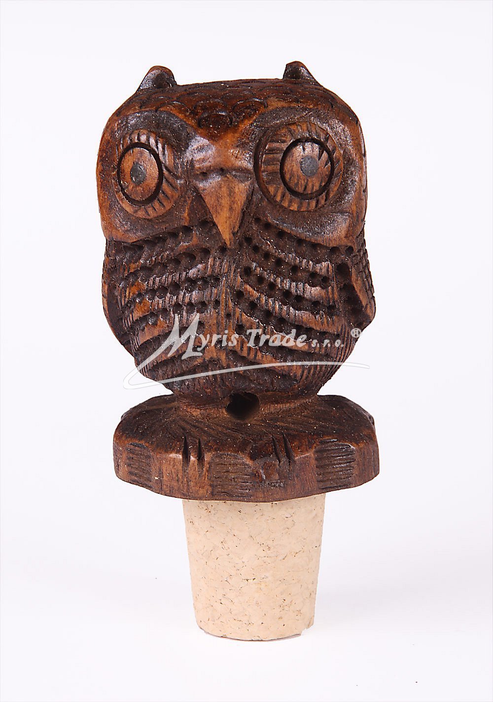 dřevěná ozdobná zátka s korkovým špuntem a figurkou sovy