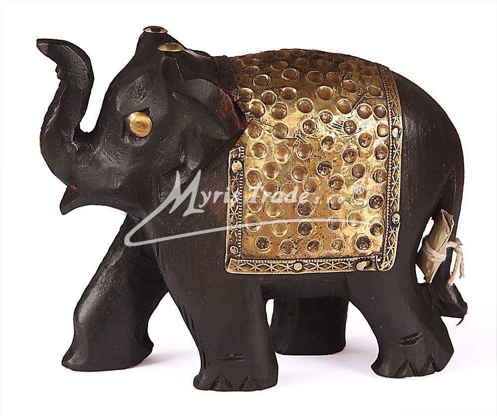 slon dřevěný - ručně vyřezávaný, tmavé dřevo, zdobený mosazí