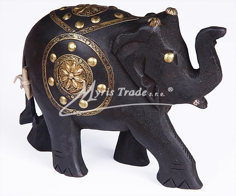 slon dřevěný - ručně vyřezávaný, tmavé dřevo, zdobený mosazí