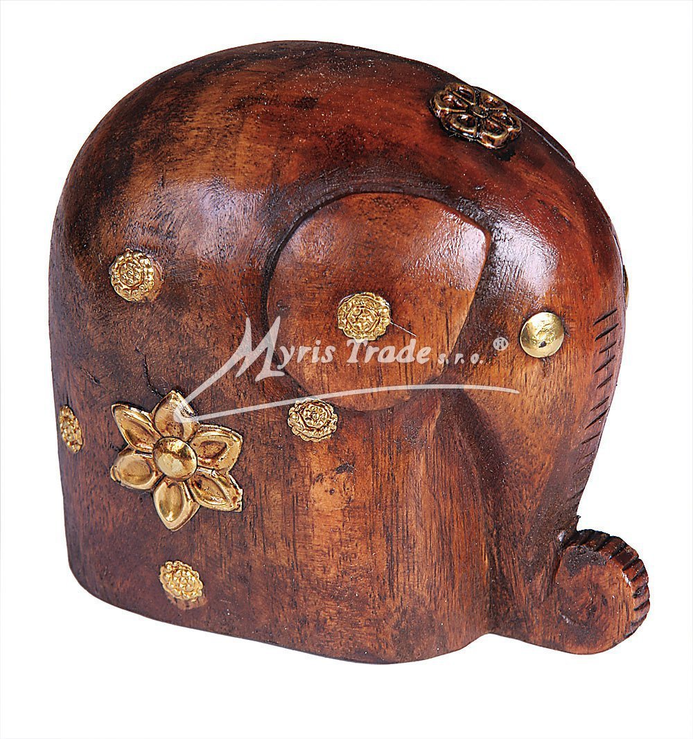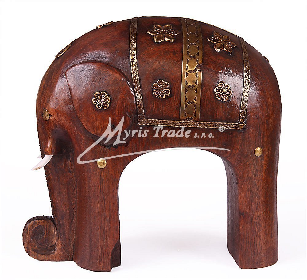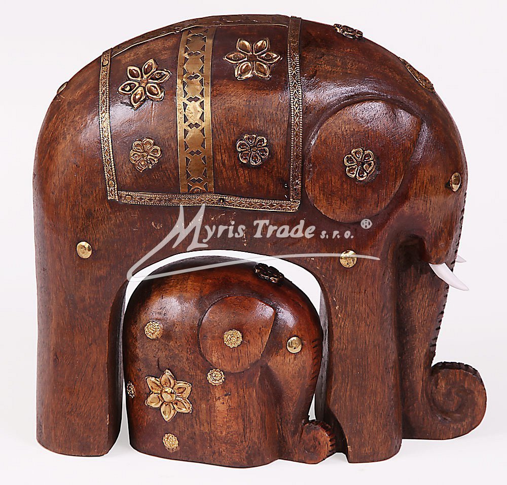 slonice se slůnětem - sestava 2 dřevěných sošek z masivního tmavého dřeva, zdobených mosazí