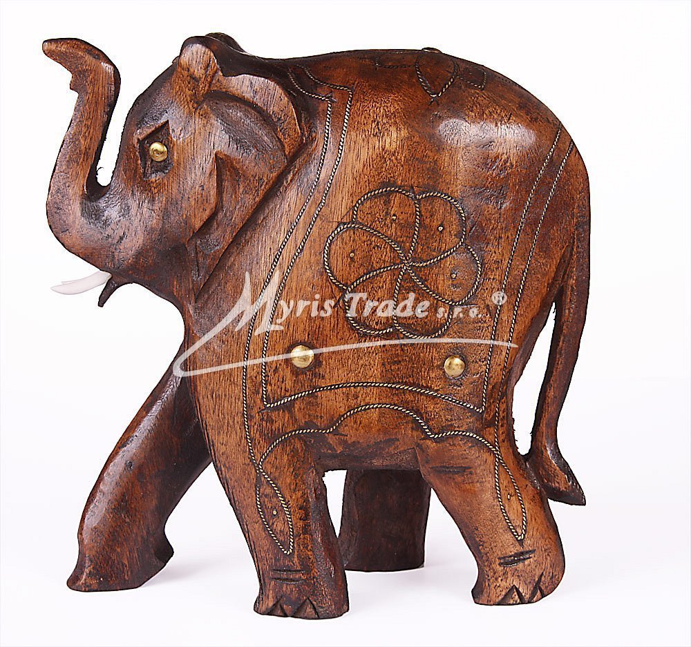 slon dřevěný - ručně vyřezávaný, tmavé dřevo, jemně zdobený mosazí