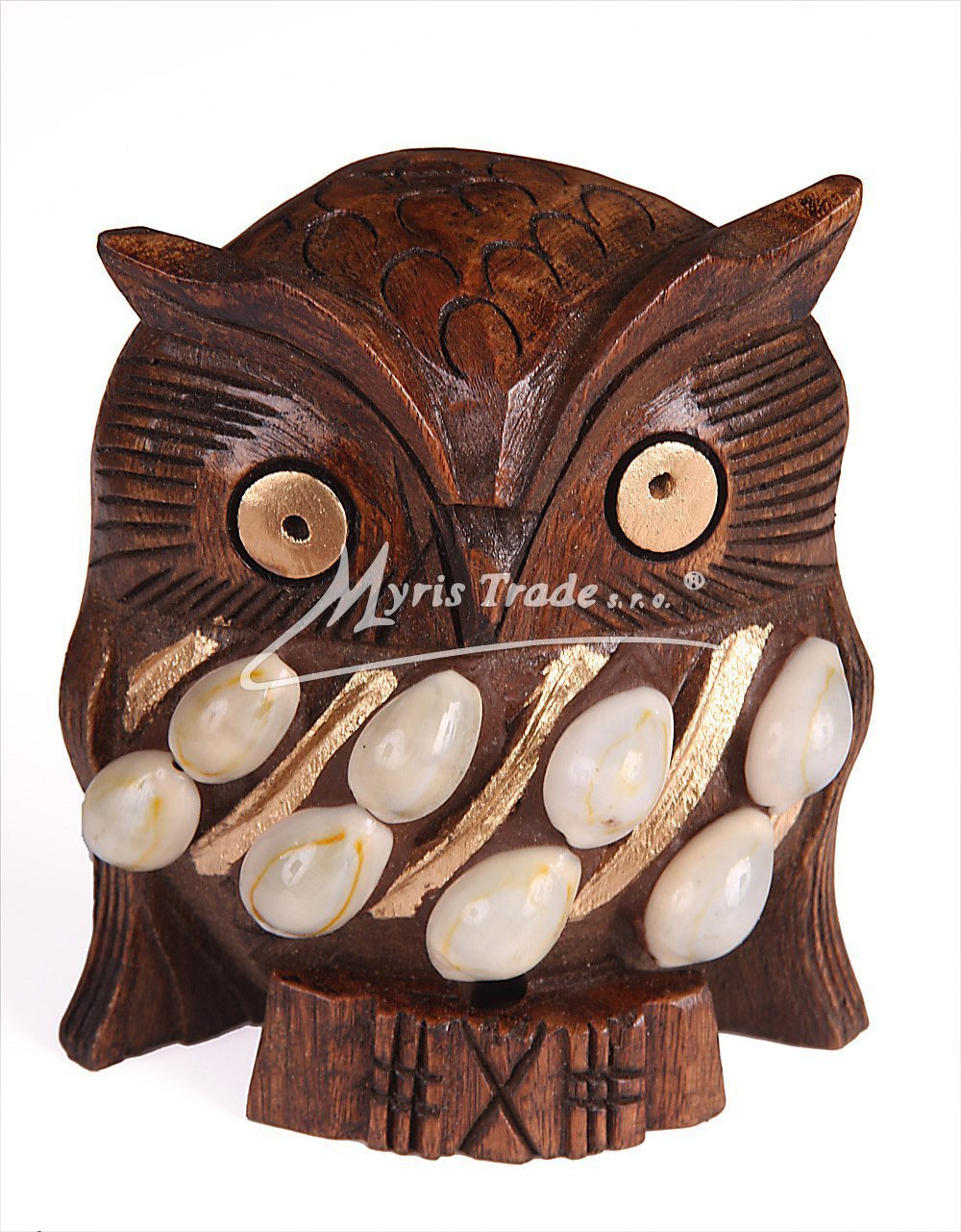 sova dřevěná - ručně vyřezávaná, tmavé dřevo, jemně zdobená drobnými mušličkami a zlacená