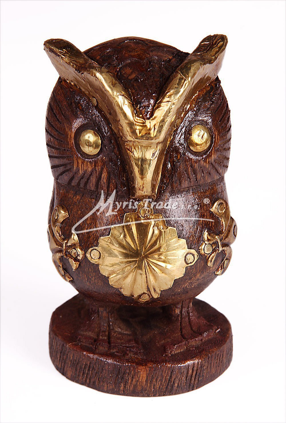 sova dřevěná - ručně vyřezávaná, tmavé dřevo, bohatě zdobená mosazí