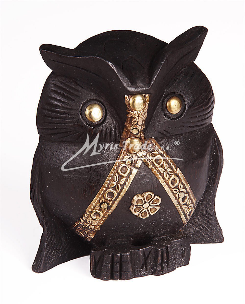 sova dřevěná - ručně vyřezávaná, tmavé dřevo, zdobená mosazí