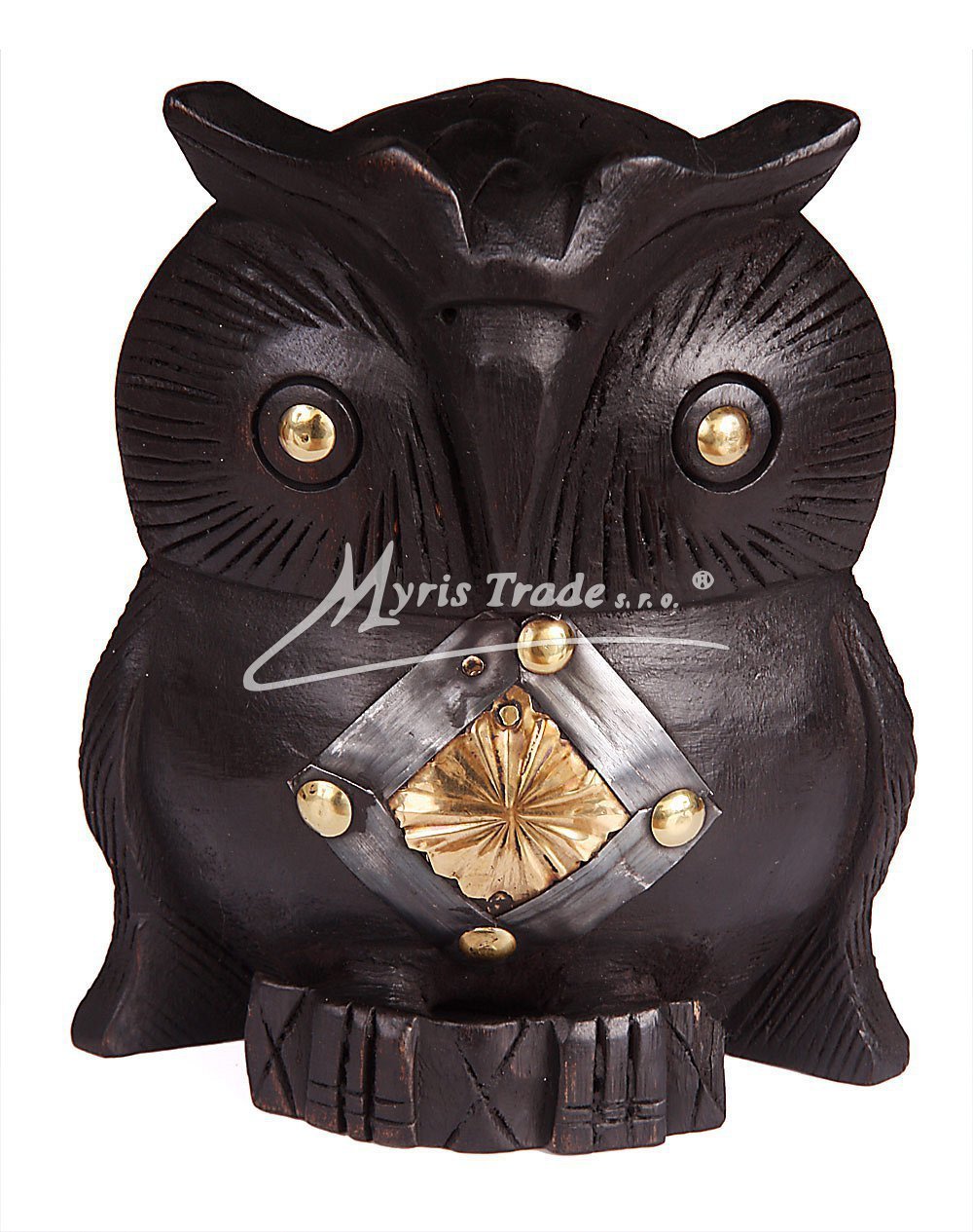 sova dřevěná - ručně vyřezávaná, tmavé dřevo, zdobená mosazí
