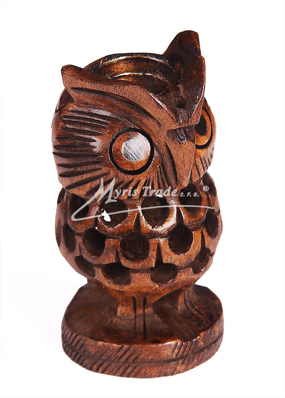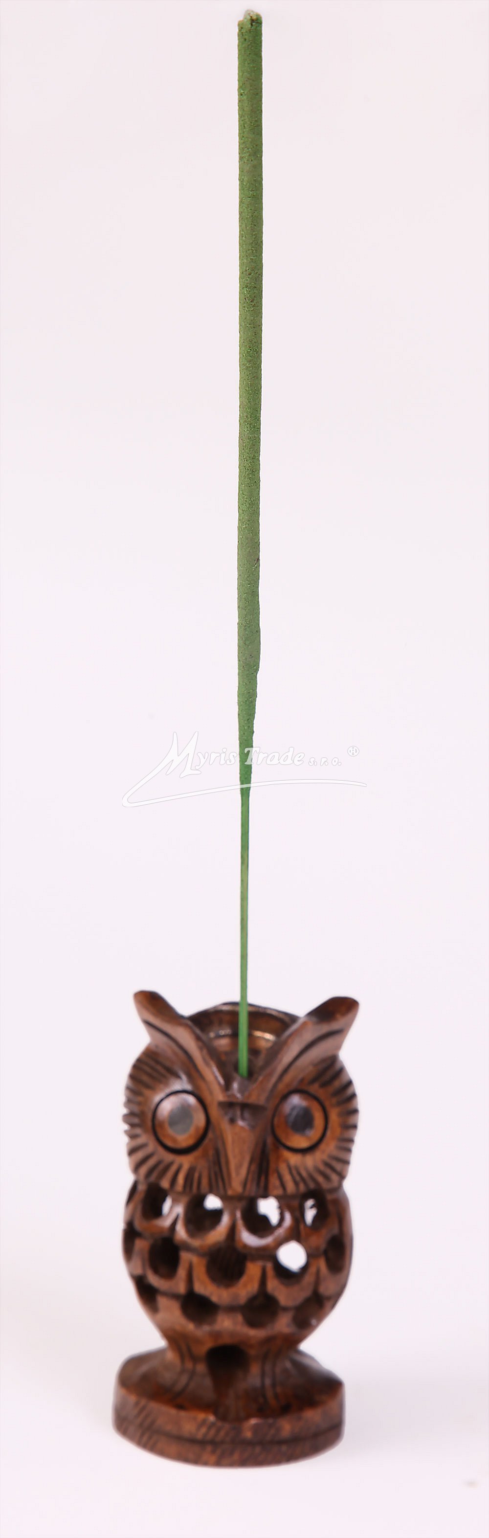 ručně vyřezávaná figurka sovy z tmavého dřeva je současně stojánek pro vonného vánočního františka a 1 vonnou tyčinku
