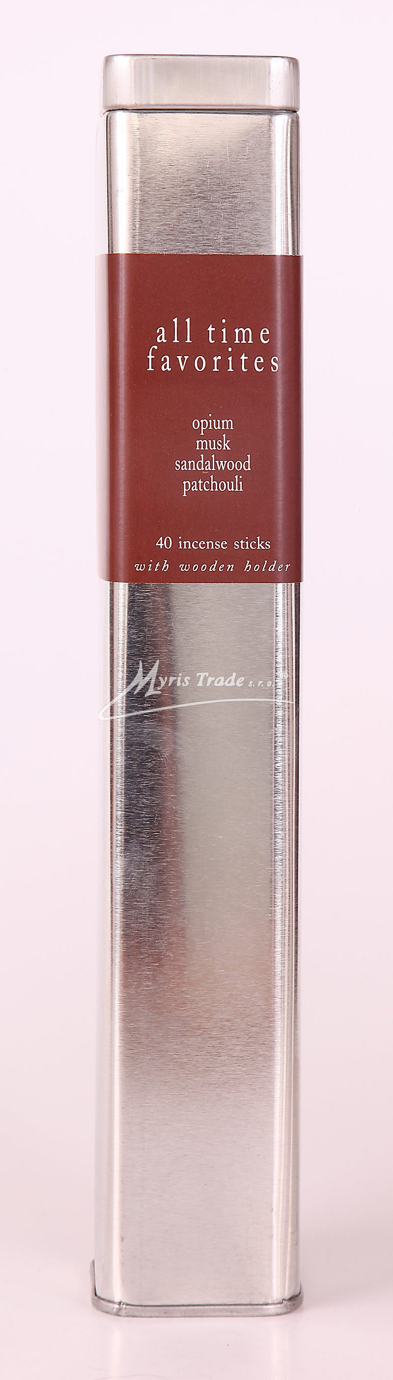 40 kusů vysoce kvalitních vonných tyčinek v dárkovém balení. Plechová čtverhranná krabice obsahuje kromě 4 různých exotických vůní tyčinek i dřevěný stojánek.