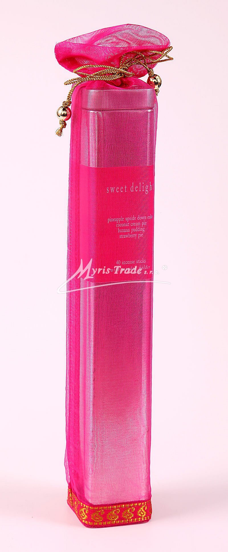 40 kusů vysoce kvalitních vonných tyčinek v luxusním dárkovém balení. Plechová čtverhranná krabice obsahuje kromě 4 různých exotických vůní tyčinek i dřevěný stojánek. Je vložena do krásného ozdobného textilního sáčku.