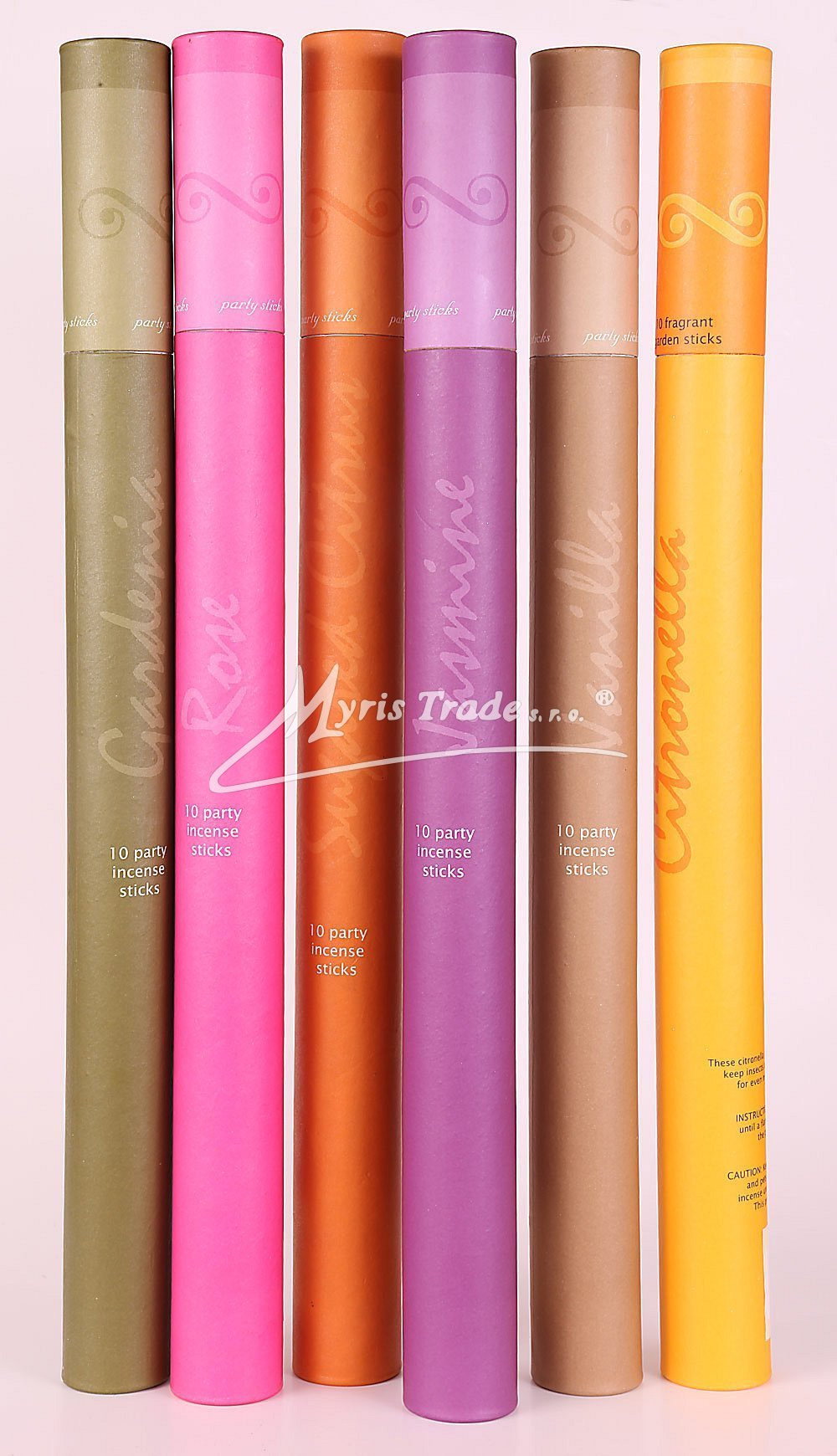 6 balení po 10ti kusech vysoce kvalitních vonných tyčinek v ozdobném papírovém dárkovém tubusu. Jsou určené pro venkovní použití např. do zahrad. Tyčinky jsou 50,00 cm dlouhé a silné 1,00 cm. Doba hoření je cca od 2,5 do 3 hodin.
