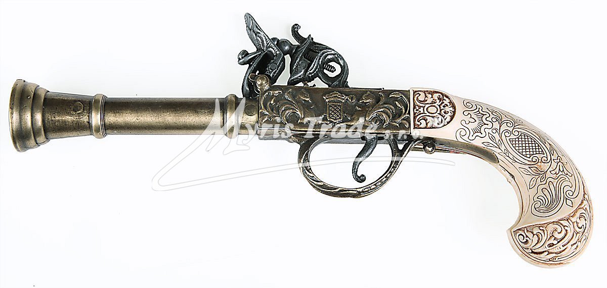 luxusně provedená nefunkční replika historické křesadlové pistole - trombónu z dokonalé imitace slonové kosti a kovu barvy bronzu