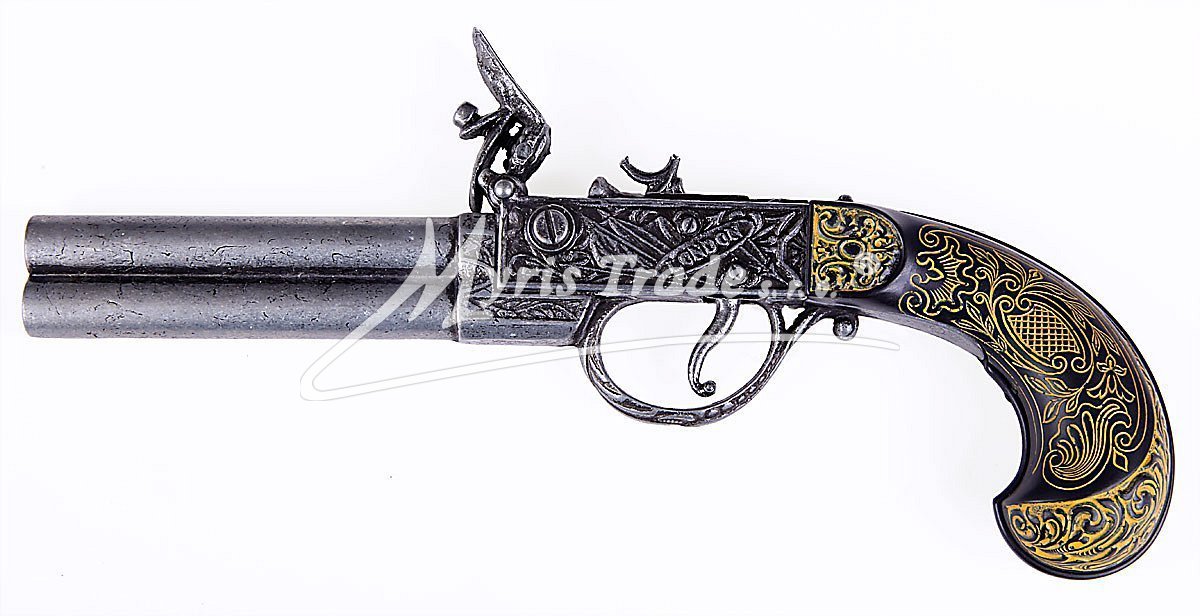 luxusně provedená nefunkční replika historické křesadlové pistole - dvouhlavňovky z dokonalé imitace ebenového dřeva a kovu stříbrné barvy