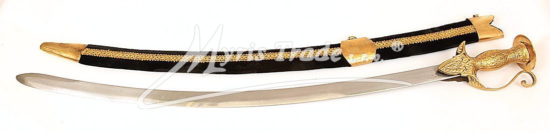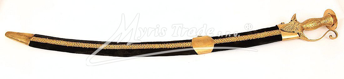 Replika historické orientální šavle s ozdobnou mosaznou tepanou rukojetí v pochvě potažené sametem v černé barvě. Šavle je určena nejen pro dekoraci, ale protože je vyvážená, skvěle se hodí i pro orientální břišní tance.