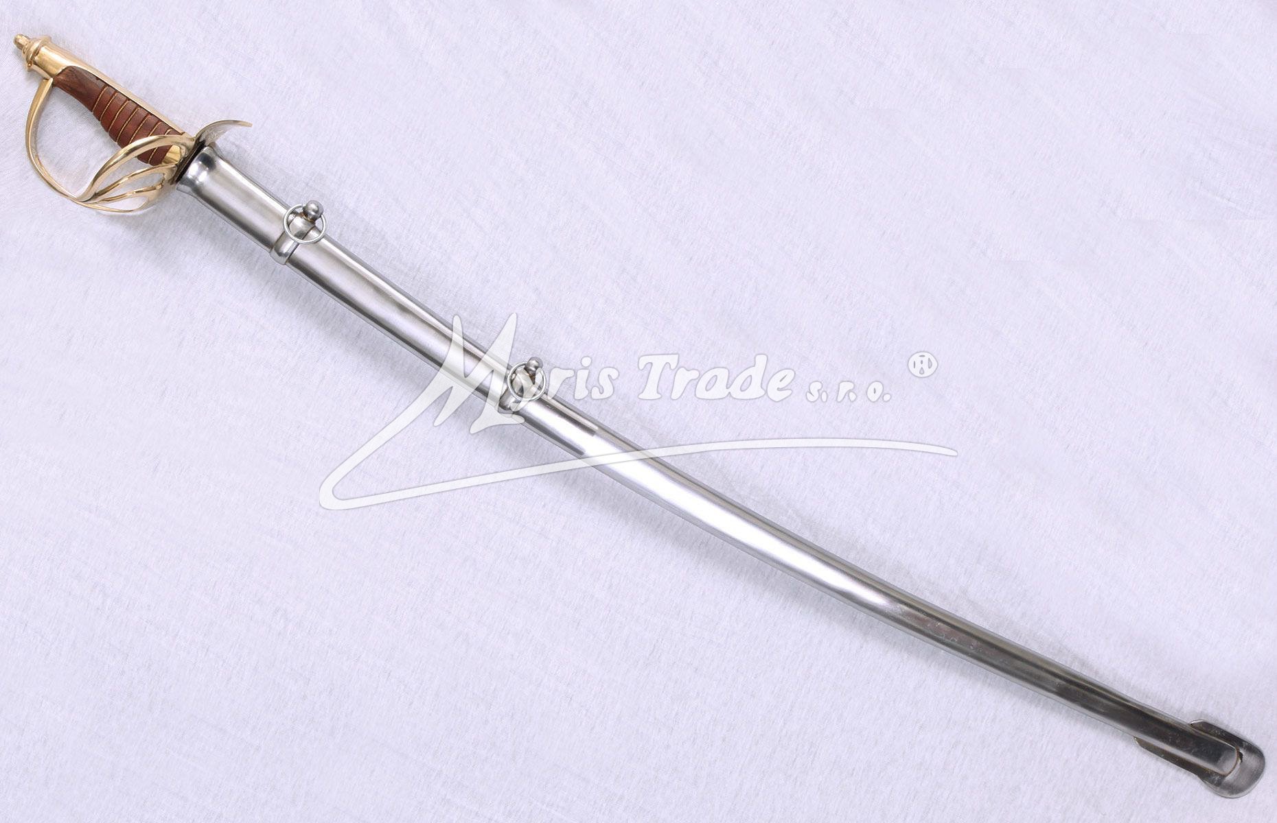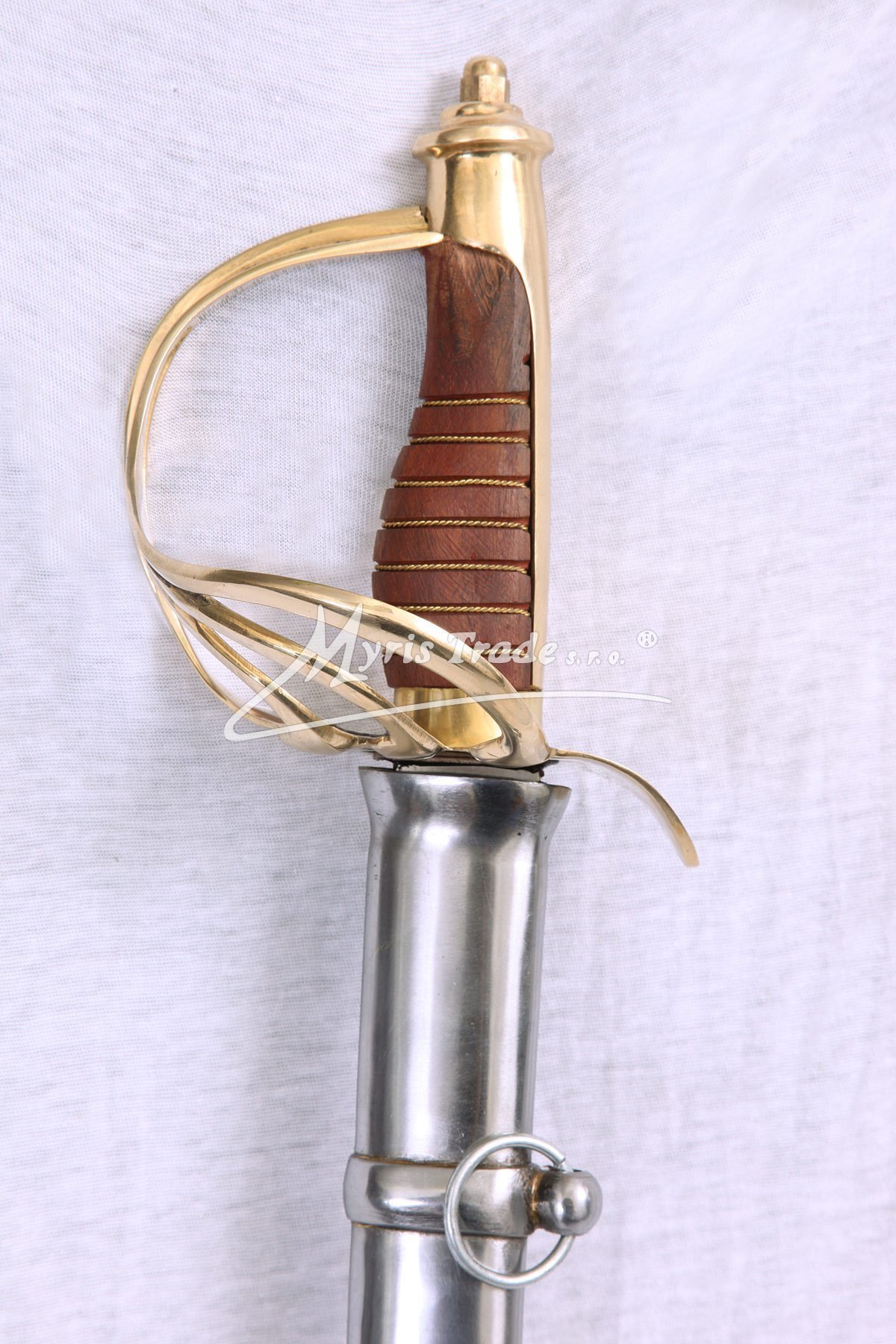 replika historické jezdecké šavle s dřevěnou rukojetí s mosazným košem v pochvě v barvě stříbrného kovu