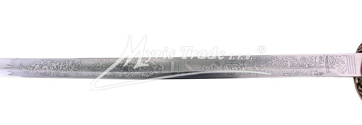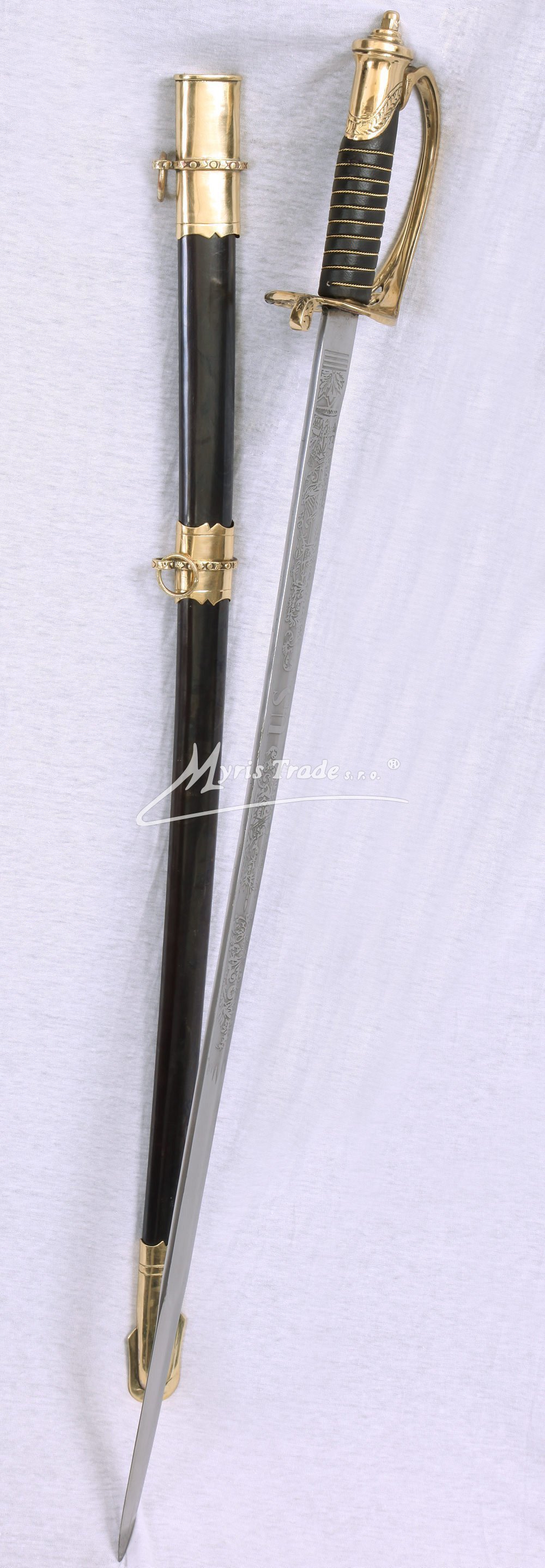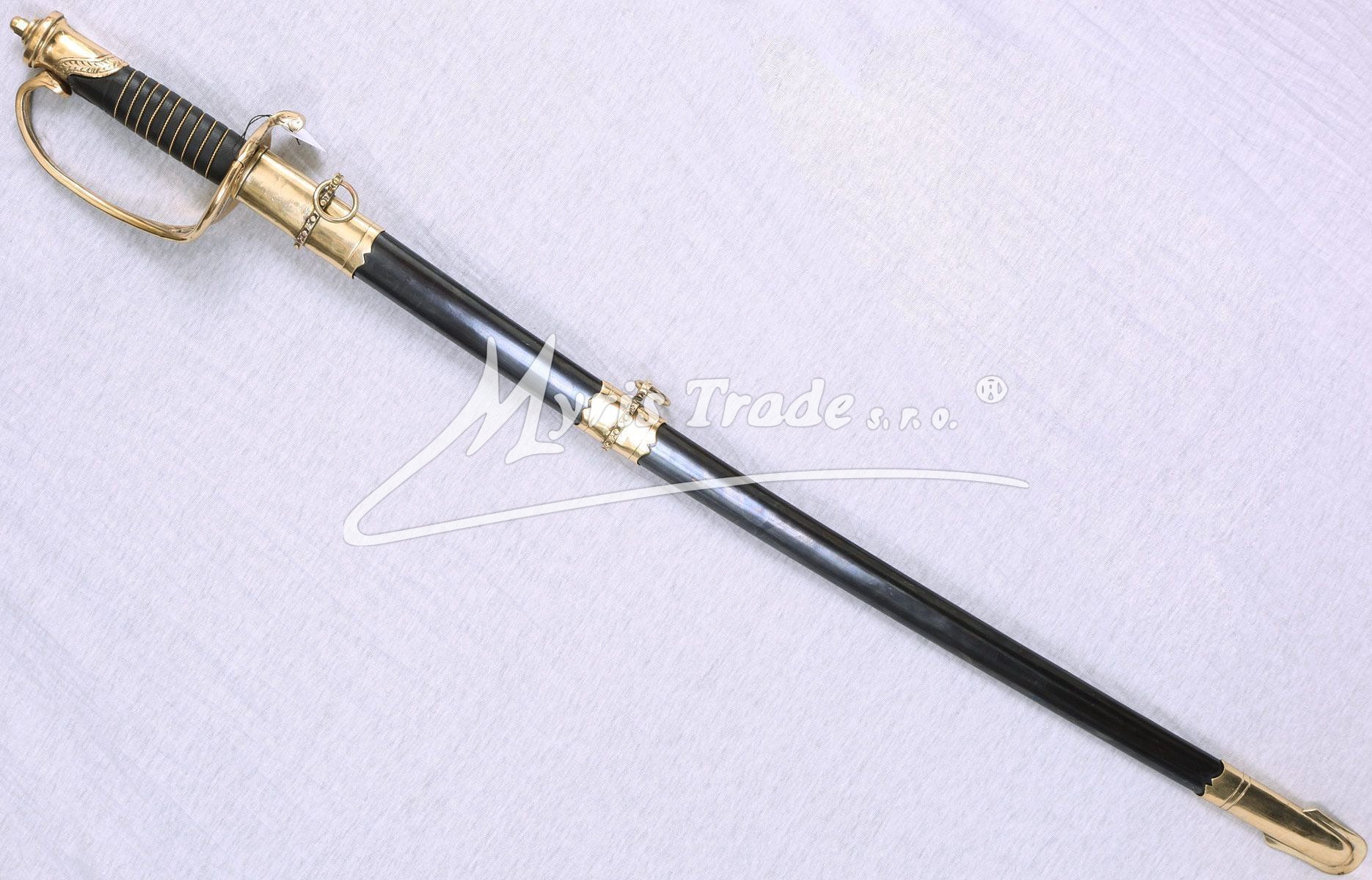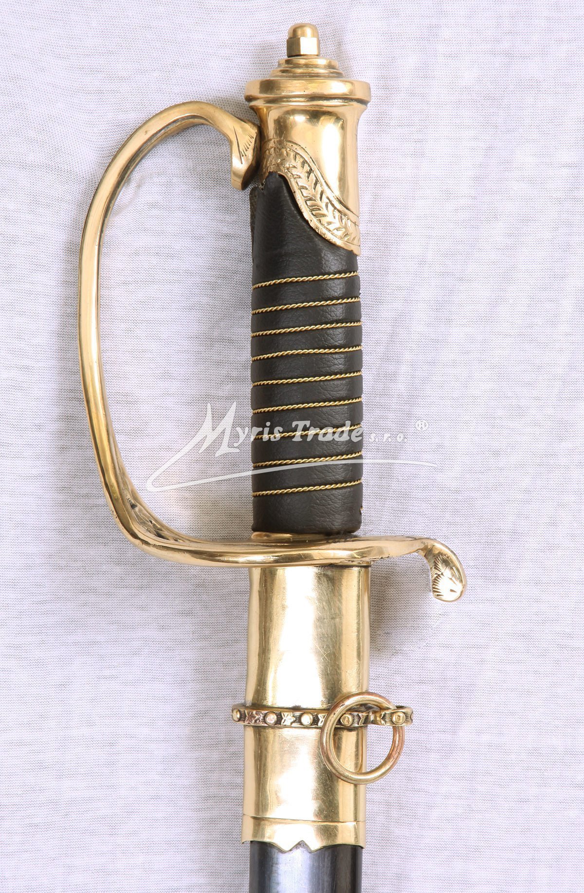 replika historické jezdecké šavle americké kavalerie s černou koženou rukojetí s mosazným, tepaným košem v kovové pochvě v černé barvě s mosaznými úchyty čepel šavle je gravírovaná