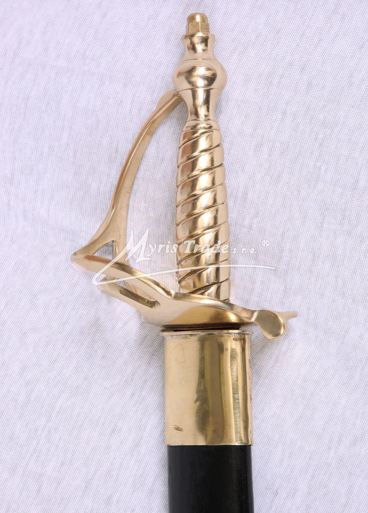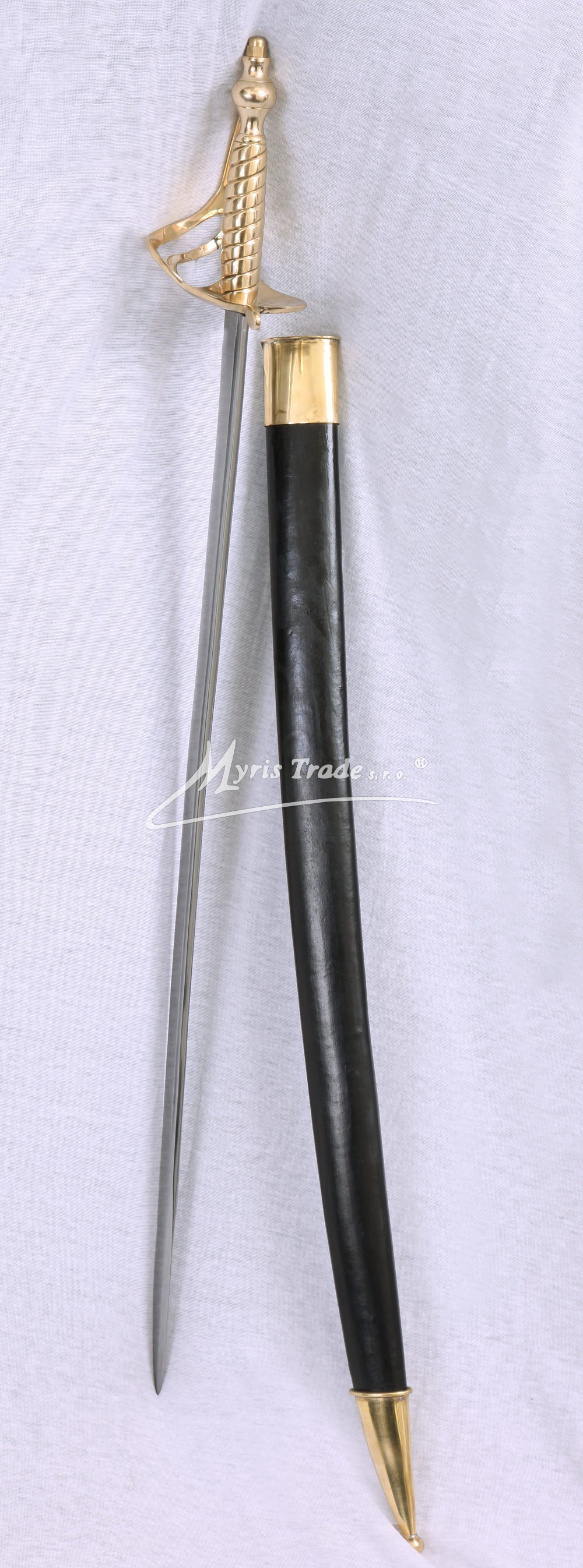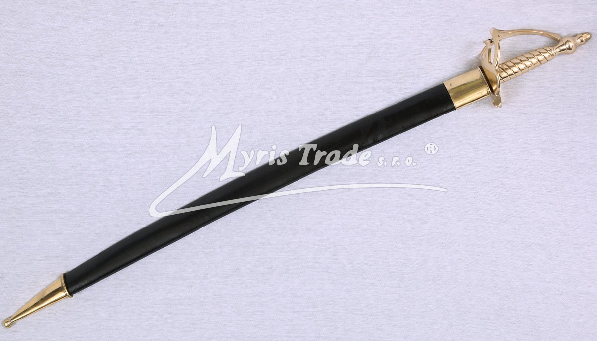 replika historické důstojnické šavle s mosaznou rukojetí v černé kožené pochvě