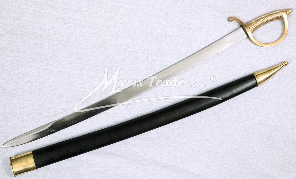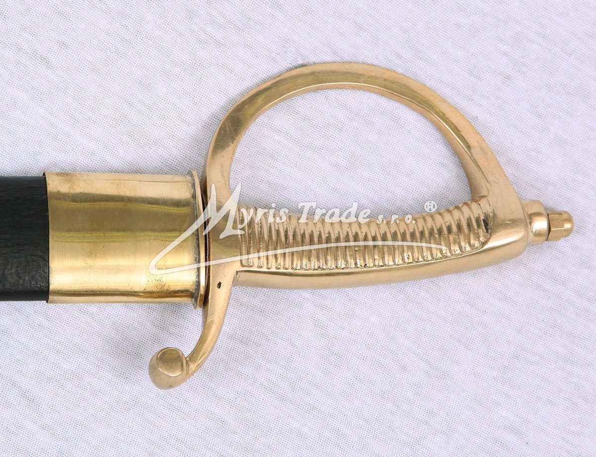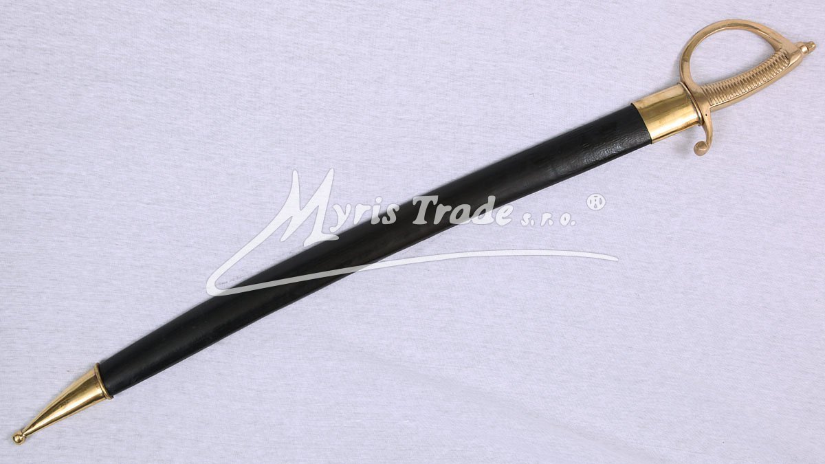 replika historické důstojnické šavle s mosaznou rukojetí v černé kožené pochvě