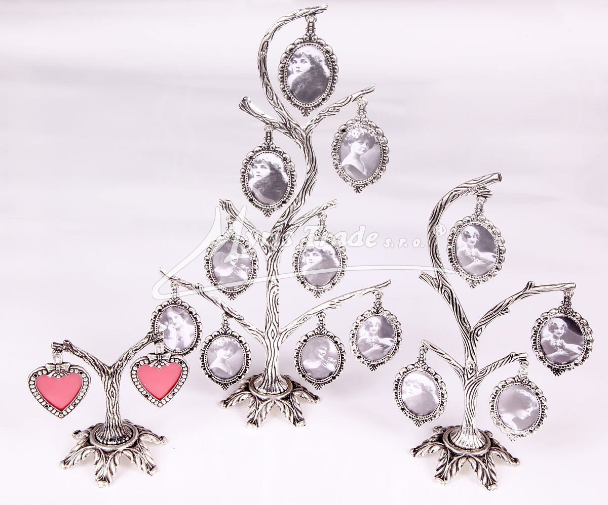postříbřený fotorámeček ve tvaru stromu se 2 fotopřívěsky určenými pro rodinné foto