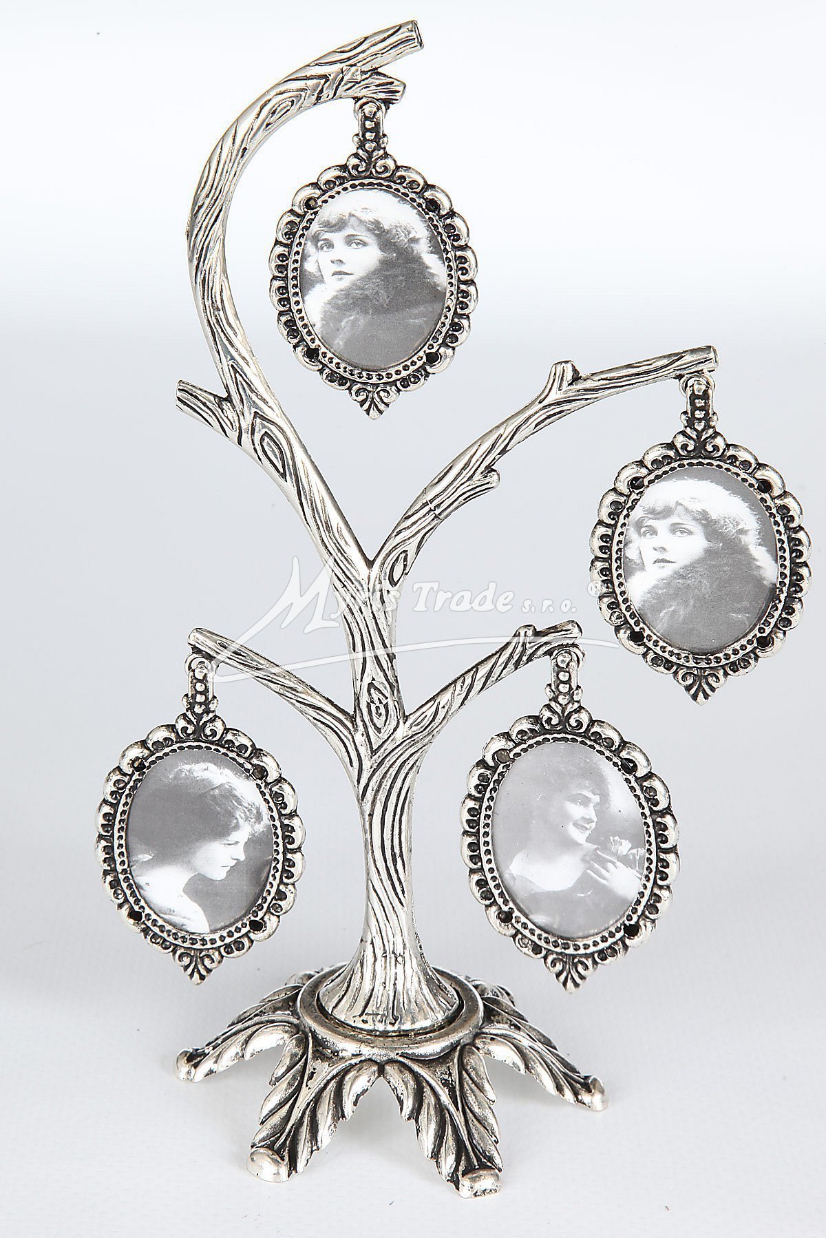 postříbřený fotorámeček ve tvaru stromu se 4 fotopřívěsky určenými pro rodinné foto, ze kterého můžete vytvořit malý genealogický strom vaší rodiny