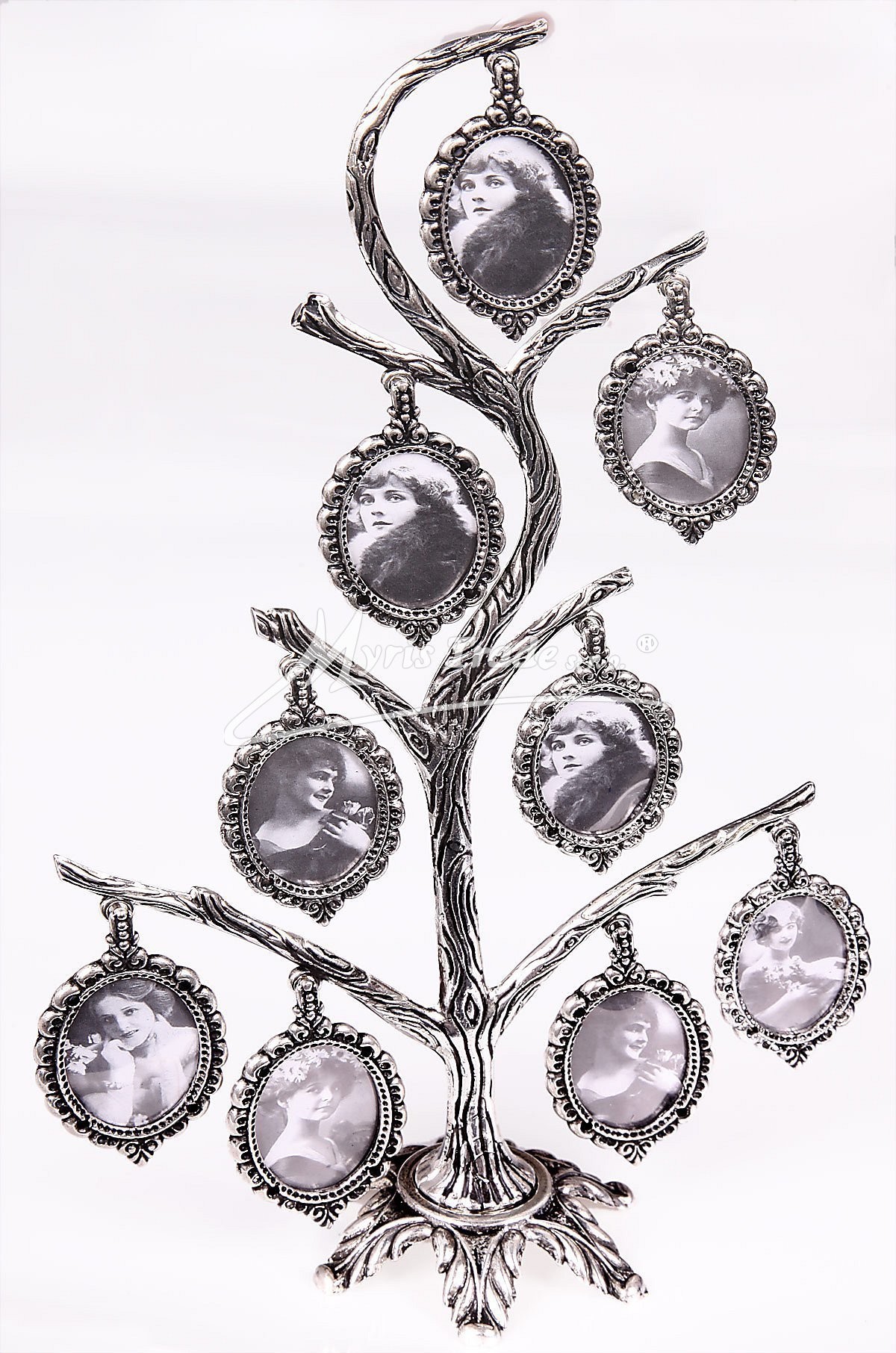 postříbřený fotorámeček ve tvaru stromu s 9 fotopřívěsky určenými pro rodinné foto, ze kterého můžete vytvořit malý genealogický strom vaší rodiny