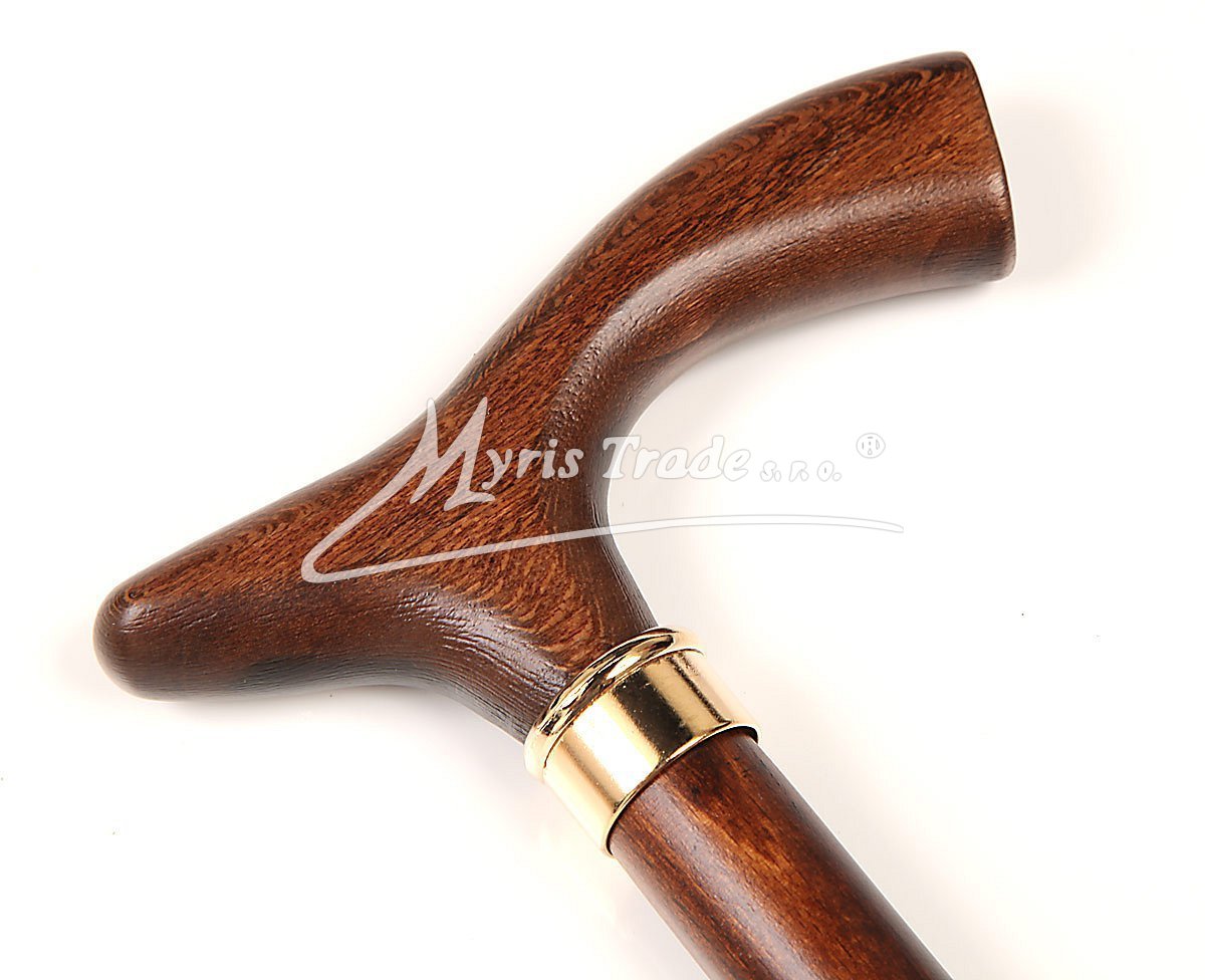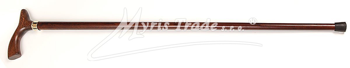 plně funkční vycházková hůl z masivního, tmavě hnědého dřeva s rovnou rukojetí a mosaznou ozdobu, umožňující pevné opření ruky