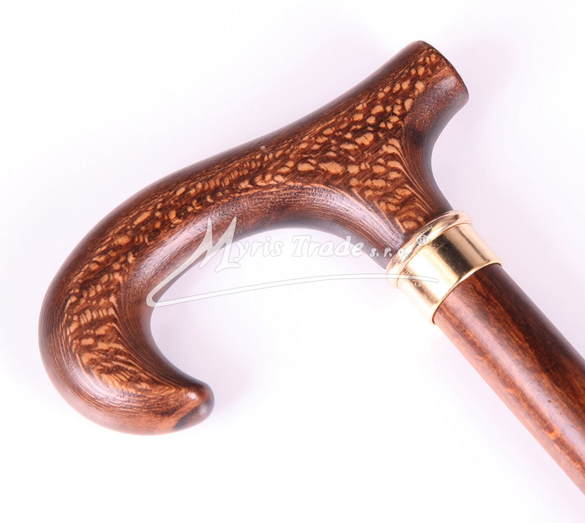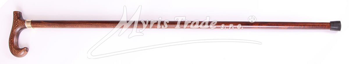 plně funkční vycházková hůl z masivního, tmavě hnědého dřeva s rovnou rukojetí a mosaznou ozdobu, umožňující pevné opření ruky